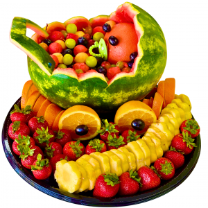 Le Classique (Baby Boy) A giftable arrangement for the birth of a new baby boy. Cantaloupe & honey dew wedges, strawberries, pineapple, grapes. With a blue apple donut and It's a Boy balloon.$46.58 (8.25% Sales Tax Extra) -